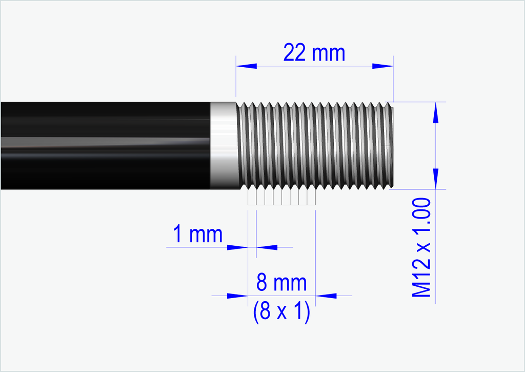 Hver av våre gjennomgående aksler er spesiallaget for deg. Vi trenger den nøyaktige monteringslengden [mm] og gjengestørrelsen (stigning) på den nåværende monterte gjennomgående akselen din.